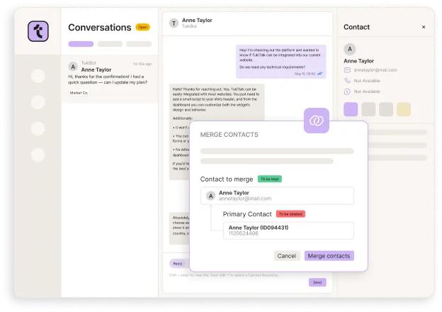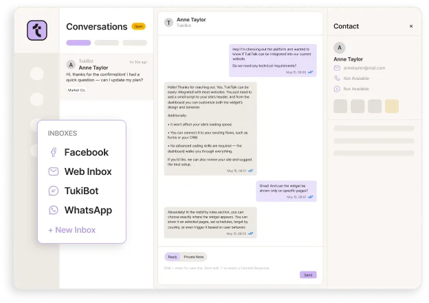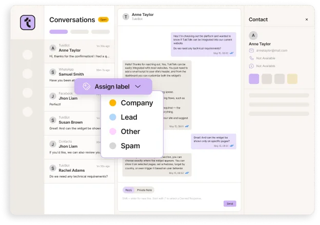 Receive messages in your unified TukiTalk inbox, see AI assist with categorization and responses, and empower your agents with smart tools.